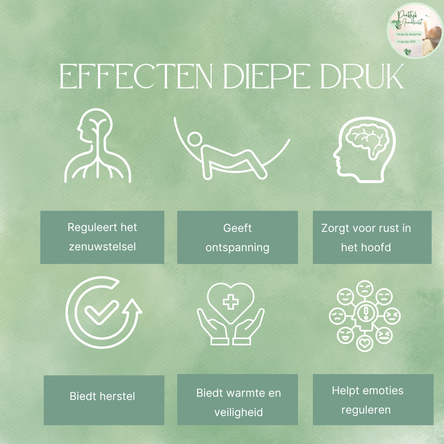 Diepe druk activeert van binnenuit het zenuwstelsel voor rust en herstel. Je lichaam gaat hormonen en stofjes aanmaken zodat je spieren kunnen ontspannen zoals dopamine en serotine. Het is een langzame beweging. Naast de fysiologische processen zorgt de druk ervoor dat je met je aandacht uit je hoofd naar je lijf gaat. Bij veel piekeren en zorgen kan diepe druk helpen om te ontspanning en in het lijf te komen.